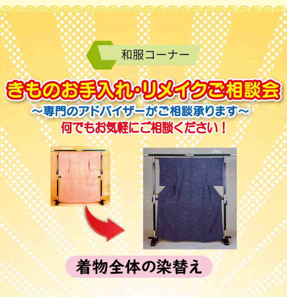 今回は着物(きものお手入れ・リメイク相談会)、健康(グッドハーツ)がメインの展示販売会「きものよみがえり展」のご案内です。