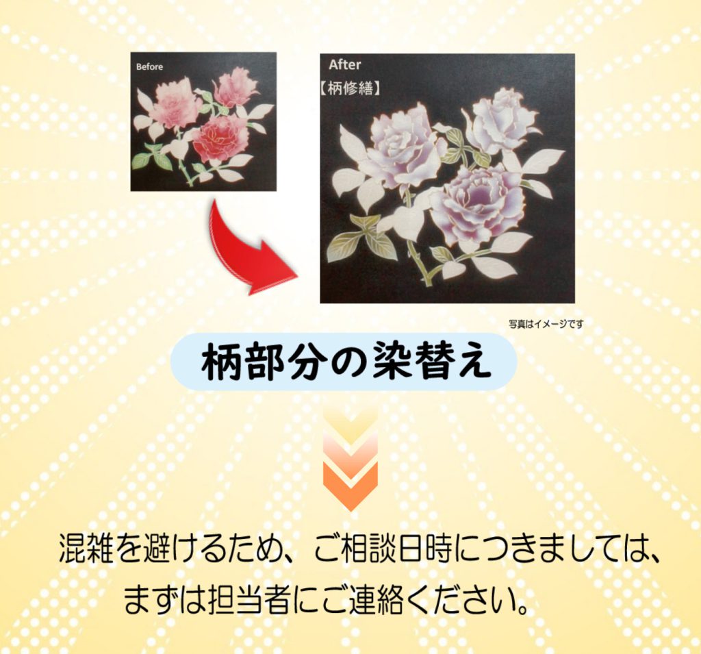着物全体の染替え・柄部分の染替えなど、専門のアドバイザーがご相談承ります!