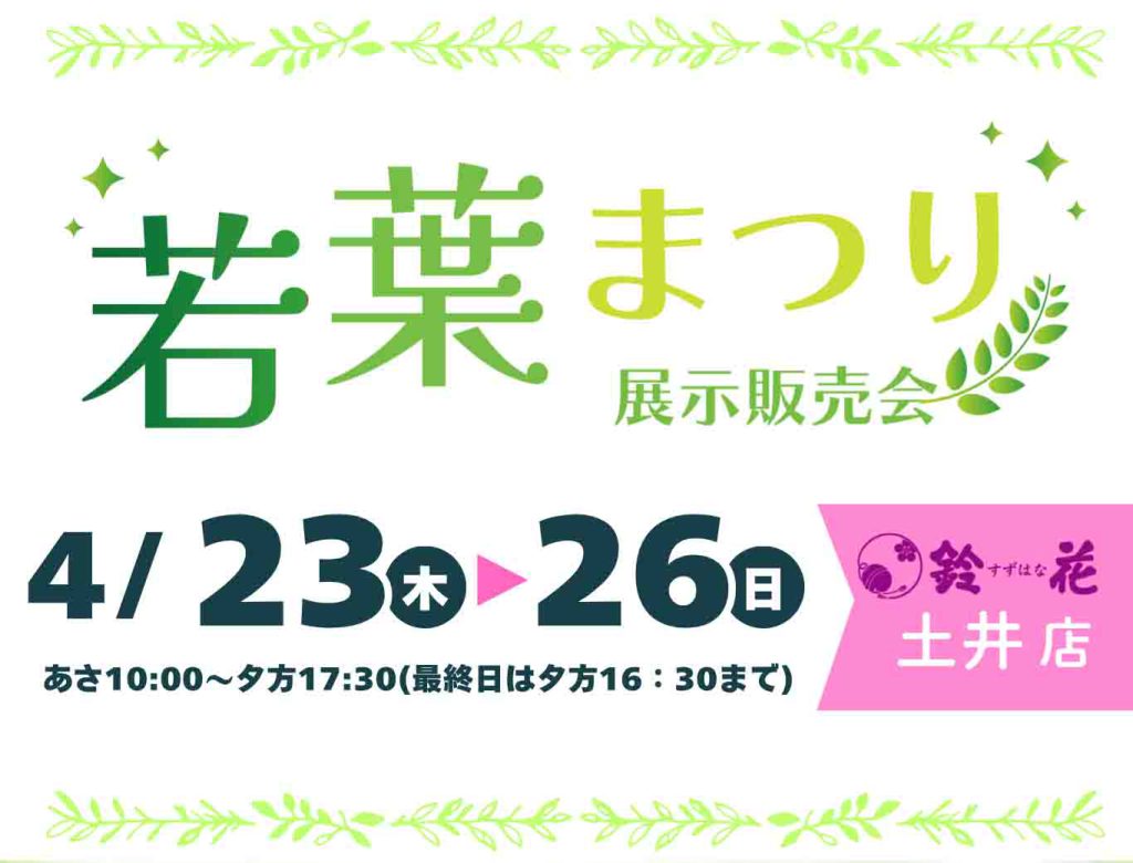 今回はバッグ・コート、健康(グッドハーツ)がメインの展示販売会「若葉まつり」のご案内です。