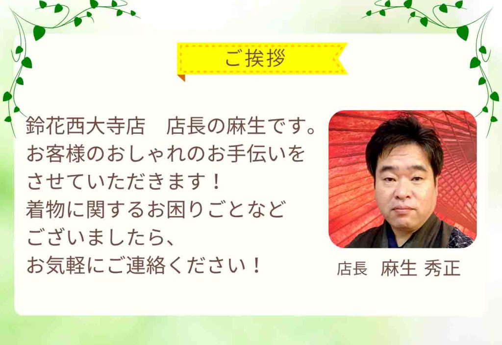 岡山県岡山市東区の着物販売店、鈴花西大寺店です。