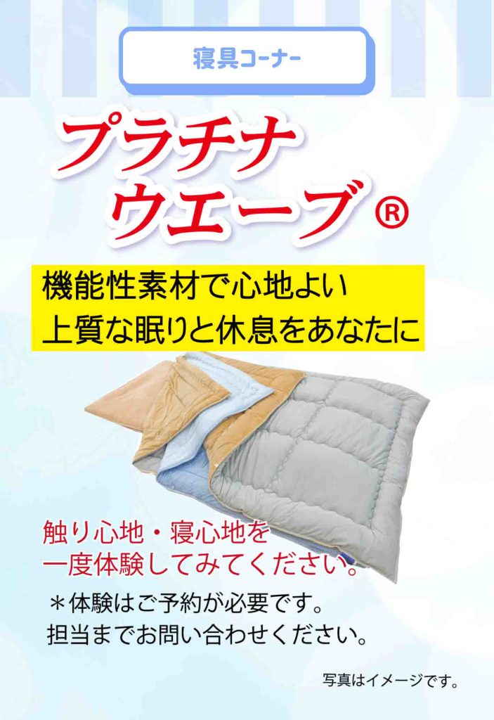 今回はバッグ・コート、寝具(プラチナウェーブ)がメインの展示販売会「ファッション展」のご案内です。